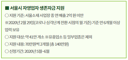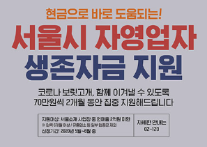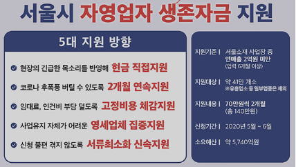 서울시에서 코로나로 힘든 영세 자영업자와 소상공인을 위해 자영업자 생존자금이라는 재난 지원금을 월 70만원씩 2개월간 현금으로 지급합니다.