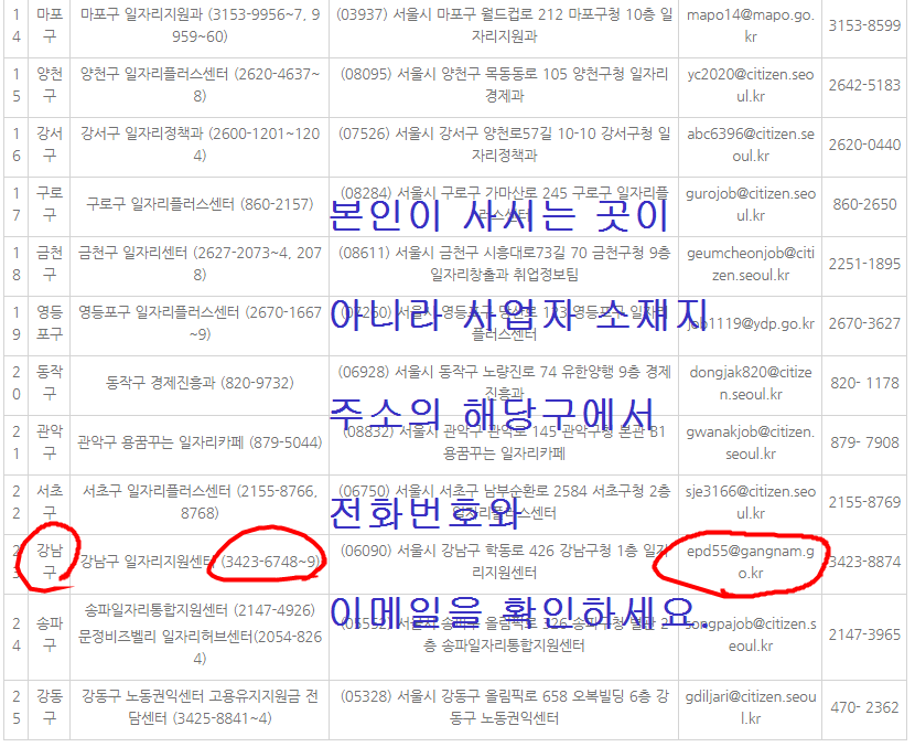 가장 중요한 접수처에 대한 정보입니다. 서울시 사업장 소재지 관련 일자리지원센터 전화번호와 이메일을 확인하세요.