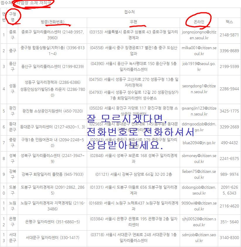 5. 상세한 문의 전화를 원하신다면 : 서울시청 일자리정책과 , 02-2133-5455, 5343 / 자치구 일자리 관련부서 참조