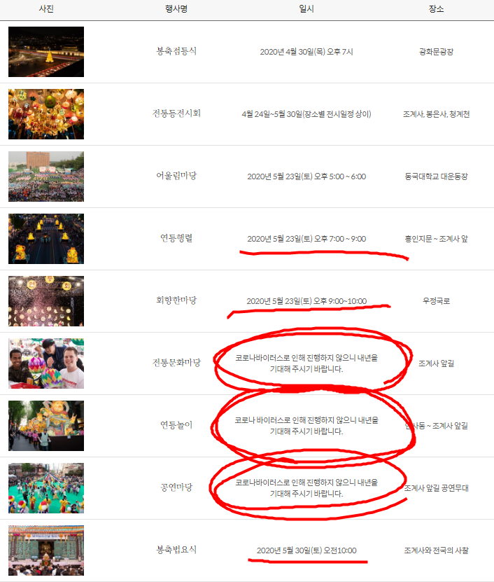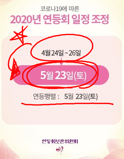 원래 서울시 연등회 2020은 4월 24일부터 26일까지 계획되어 있었습니다. 하지만 코로나 19 확산방지에 따라서 5월 23일 토요일로 변경되었습니다.
