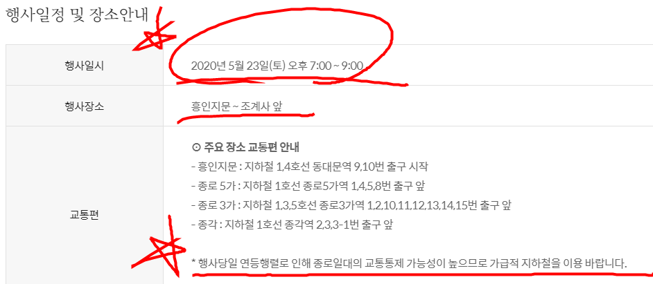 보시는 것처럼 연등회 행렬은 2020년 5월 23일 토요일에 저녁 7시부터 9시 사이에 실시 합니다. 해결 장소는 흥인지문에서부터 조계사앞 까지이며 당일 날에는 교통 혼선으로 인하여 자가용이 어려울 겁니다. 그러니 대중교통을 이용하여 행사에 참여해 주시면 더욱 더 편하게 행사를 즐기실 수 있을 겁니다. 위의 연동이 홈페이지에 나와있는 교통편안내를 참고하세요~