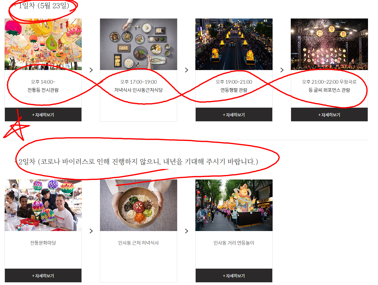 또한 1일차 행사만 진행하고 2차 행사는 코로나 바이러스 확산 방지를 위해서 진행하지 않으니 내년에 기대하라는 안내 사항이 있습니다. 아쉽지만 코로나 확산 방지를 위해서 전국민이 힘들게 노력하고 있는 상황이니 서울시 연등에 2020 참가 하시는 분들은 이에 협조하여 2일차에는 연등회의 일정이 없으니 이점 참고 바랍니다.