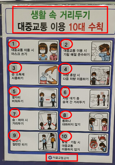 지하철이나 버스 정류장을 지나가다 보면은 위와 같은 코로나 예방 행동 수칙 포스터를 볼 수 있습니다. 생활속 거리두기 대중교통 이용 10대수칙이라고 합니다.