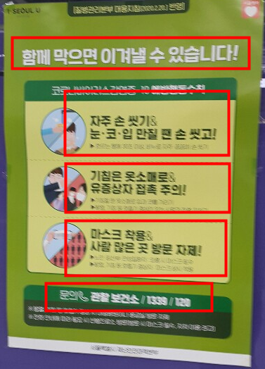 위와 같이 코로나 바이러스 감염증 19 사회적 거리두기 예방 행동 수칙 3가지 포스터가 있습니다. 문의하실 사항이나 궁금하신 점은 다날 보건소 1339 번 혹은 120번에 전화 하시면 된다고 나와 있습니다.