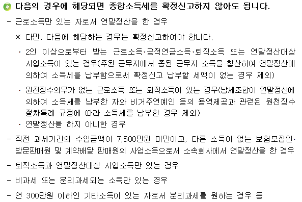 위의 경우에는 종합소득세를 확정신고 안 하지 않아도 된다고 나와있는데요, 근로소득만 있는 자로서 연말정산을 한 경우 종합소득세는 확정신고 하지 않으셔도 된다고 나와있습니다. 직장인의 경우 종합소득세를 신청하지 않는 경우도 있겠네요. 저처럼 자영업자는 대부분 종합소득세를 직접 국세청 홈택스에서 신청을 하실 겁니다. 연말정산을 한 경우 종합소득세를 신청하지 않는 경우가 많이 있겠네요. 또한 비과세 분리과세가 되는 소득만 있는 경우에는 종합소득세 확정신고를 하지 않아도 된다고 나와 있습니다. 그리고 연 300만원 이하의 기타소득이 있는 자로서 분리과세를 원하는 경우 등 종합소득세 확정신고를 하지 않는 경우가 많네요. 정확한 내용은 국세청 홈택스 홈페이지나 문희 전화로 꼭 다시 한번 확인하시기 바랍니다.