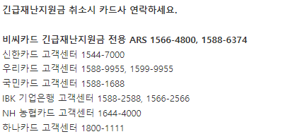 그리고 현재까지는 긴급재난 지원비를 기부 했다면 취소가 당일 취소가 가능하다고 하고 당일이 아닌 경우 확실치 않으니 각 공식 은행별 카드사 전화번호로 전화하셔서 문의해보세요. 실수로 긴급 제한 지원비를 기부 하면은 당일 취소가 아니더라도 나중에 취소 할 수 있게 빨리 처리가 됐으면 좋겠습니다 국민청원제도 긴급 재난 지원비 실수로 기부한 사람이 많아서 이 점을 계산해 달라고 청원이 많이 들어왔습니다. 많은 분들이 실수로 긴급 재난 지원비를 기부해서 취소하기를 원하신다면 빨리 처리되서 코로나19로 힘든 시기에 가정에 경제적으로 도움이 되시기를 바랍니다.