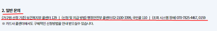 가구원 산정 기준은 보건복지부 콜센터 129에 신청 및 지급 방법은 행정안전부 콜센터 02-2100-3399, 국민콜 110, 조회 시스템 장애는 070-7825-4467, 0159로 전화해보세요.