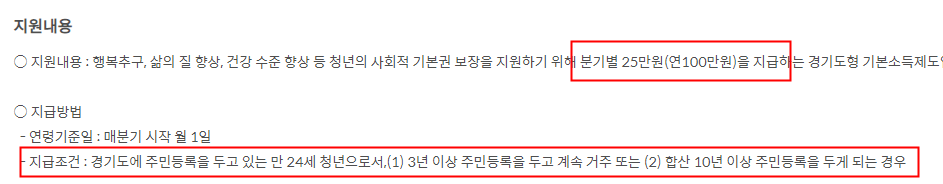신청자격은 위에서 설명드렸다시피 경기도의 거주하고 있는 만 24세 청년으로 3년 이상 주민등록을 두고 합 10년 이상 주민등록을 두고 있어야 합니다.