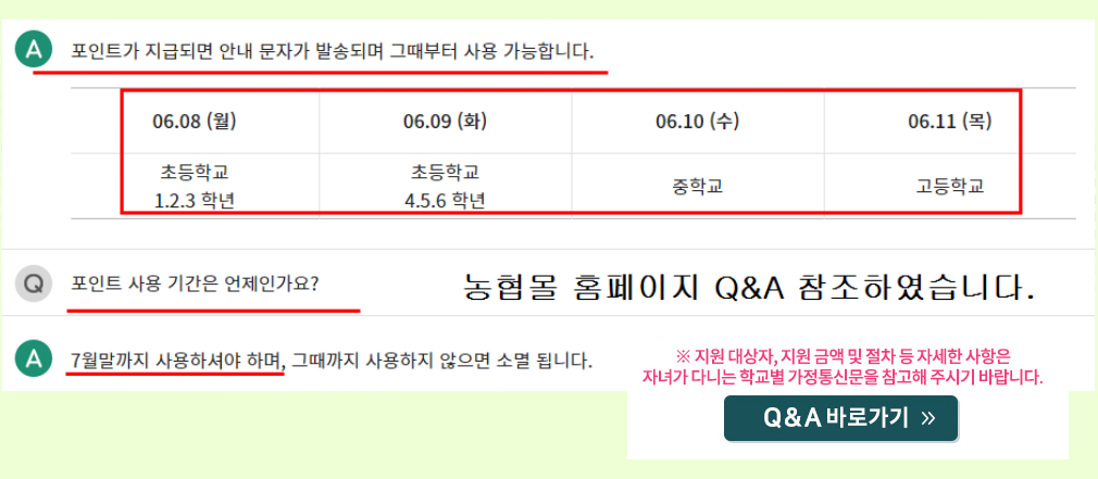 농협물 포인트로 4만 원이 농협몰에 충전되면 위에 보시는 것처럼 초등학교, 중학교, 고등학교 별로 농협몰 포인트 사용 시작 기간이 나와 있습니다.