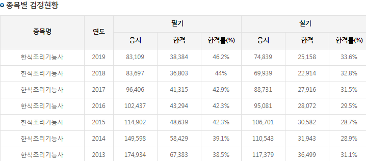 한식조리기능 저는 필기시험을 40% 합격률과 실기시험은 30% 합격율을 보이고 있습니다. 열심히 하면 누구나 합격할 수 있는 자격증 미니 좋은 성과 있으시길 바랍니다.