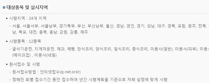 한식조리기능사 외도 굴삭기운전 지게차 운전 제과 제빵 한식조리 양식조리 일식조리 중식조리 미용사 피부 일반 메이크업 메일 등 12 종목을 상시 필기 지원에서 대신 시험을 보실 수 있습니다.