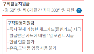 그럼 구직활동지원금은 얼마나 지원해주는 건가요? 매월 50만원X 6개월 = 300만원까지 지원해줍니다.