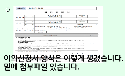 이의 신청 취지 및 사유 에다가 해당 사유를 체크하고 필요한 첨부 서류가 있으면 첨부 서류도 준비해서 가는 것이 좋습니다.