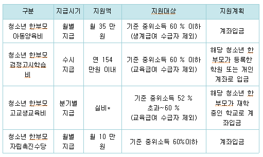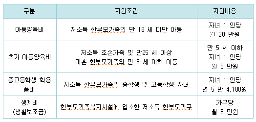 한부모 가정 가족 지원(아동 양육비, 교육비, 생활보조금 등)