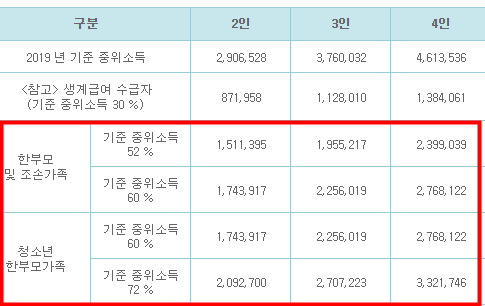기준중위소득 60% 이하일 경우 해당 됩니다.