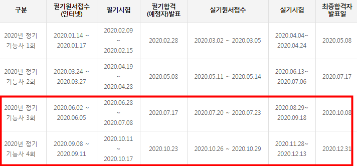 앞으로 남은 2020 정보처리기능사 시험일정은 필기시험은 2020년 6월 28일부터 7월 8일 자이에 전기기능사 3회 시험 있습니다.