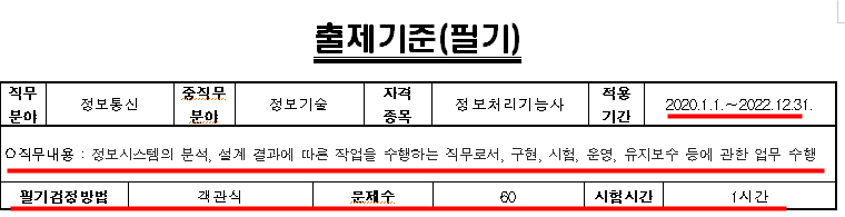 정보시스템 분석 설계 결과에 따른 작업을 수행하는 직무 구현 시험 등 다방면에 가는 업무 수행에 대한 능력을 필기시험에서 이론상 자르고 있습니다. 객관식 시험이고 문제에서는 60항입니다. 시험시간은 1시간이며 공 불고 구매하셨다면 무조건 시간이 아니니라 판단됩니다.