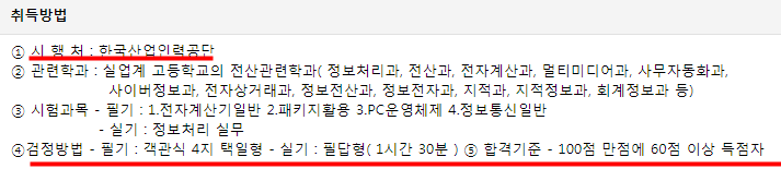 정보처리기능사 필기시험은 객관식 4지 선택형이며 6시 평이고 1시간에 시험 시간이 부여 됩니다. 실기시험에 경우에는 필답형으로 1시간 30분이 부여되며 100점 만점에 60점 이상 득점을 하셔야 합격하실 수 있습니다.