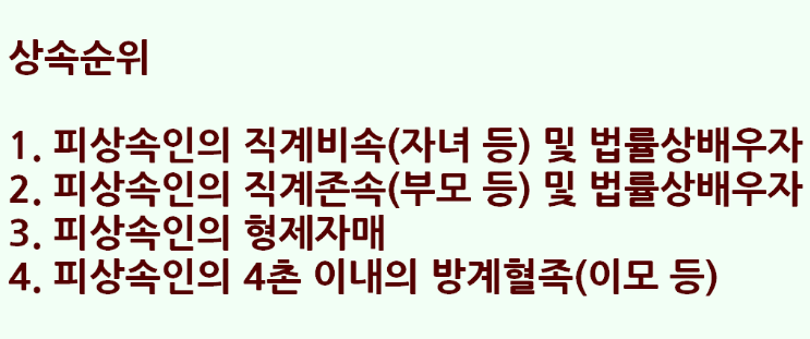 상속에서는 상속 순위가 중요한데 위에서 보시다시피 상속 순위 1순위는 피상속인의 직계 비속 즉 자녀와 법률상 배우자가 상속 순위 1순위입니다. 피상속인의 직계 존속 부모의 경우에는 2순위로 자녀보다 후순위로 되어 있습니다.