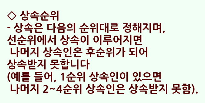 상속은 순위대로 장덕 받으며 선순위에서 상속 이루어지면 대부분의 경우 호순이에서는 상속을 받지 못한다고 합니다.