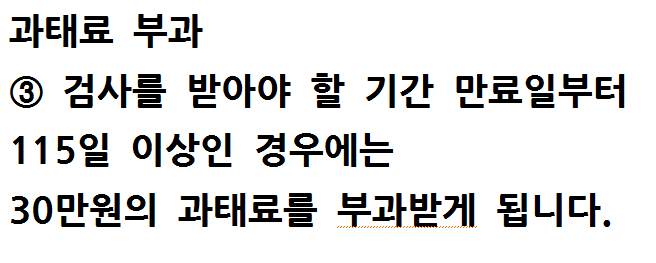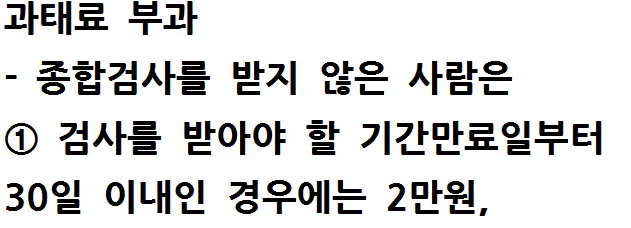 - 종합검사를 받지 않은 사람은 검사만료일로부터 30일 이내일 경우 2만원, 검사만료일로부터 30일~114일 이내일 경우 2만원, 31일부터 3일까지 3일마다 1만원, 115일 이상일 경우 30만원의 과태료가 부과된다고 합니다.