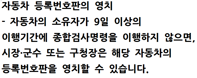 - 시행일 9일 이상 동안 차량 소유자가 종합검사명령을 이행하지 아니한 때에는 시장·군수 또는 구청장이 차량번호판을 비치할 수 있다.