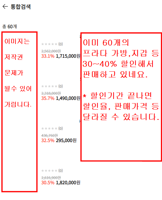 프라다 가방, 지갑 등 관련된 할인 내용이 보입니다.