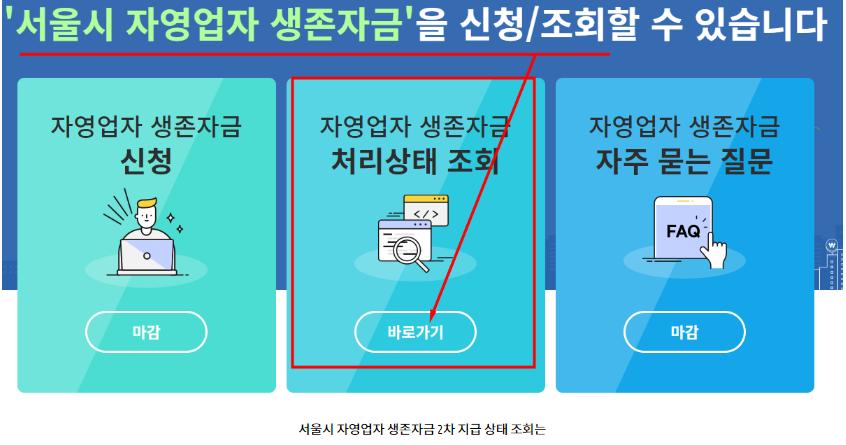 아래 서울시 자영업자 생존자금 처리상태 조회사이트에서 확인바랍니다.