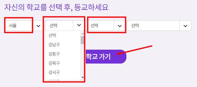 본인의 학교 지역을 선택하시고 학교목록에서